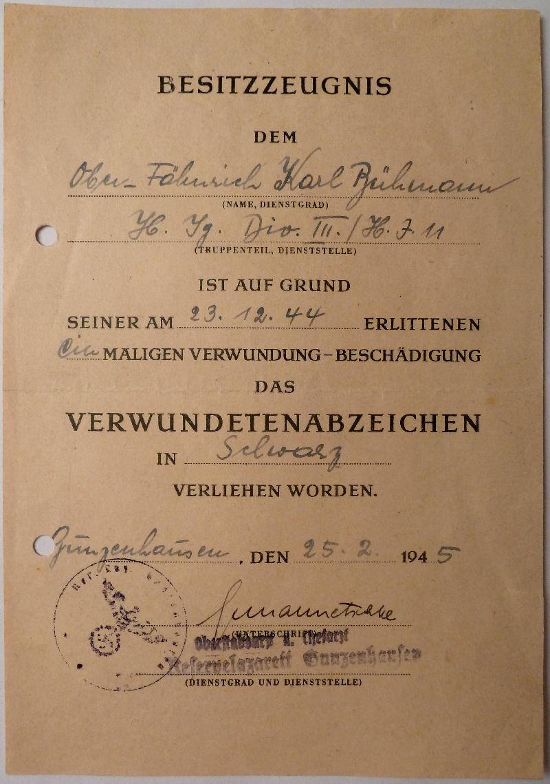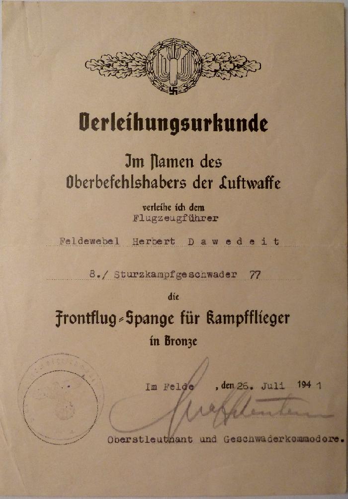 Awarded to Herbert Dawedeit of SG77. Dawedeit also earned