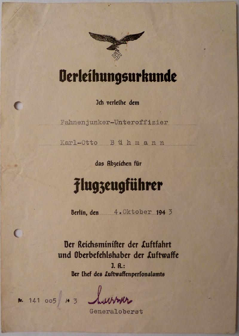 A fine set of documents to Oberfähnrich Karl-Otto Bühmann, fighter pilot with J.G. 53 ,